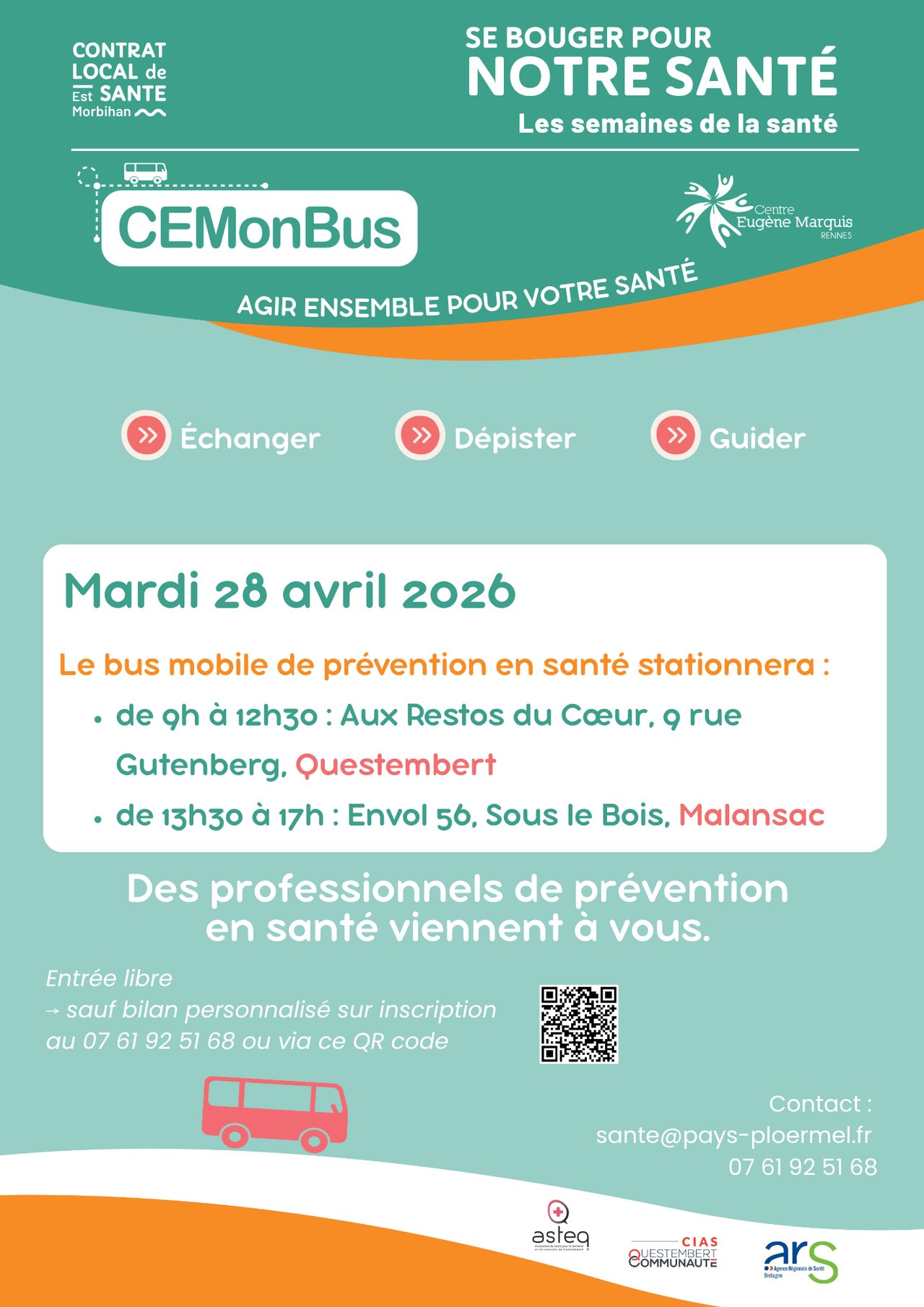 Le CEMonbus (bus de prévention en santé) sera présent à Malansac le mardi 28 avril. Ce dispositif propose des interventions gratuites et anonymes afin d’offrir aux habitants des conseils personnalisés en matière de prévention santé.
