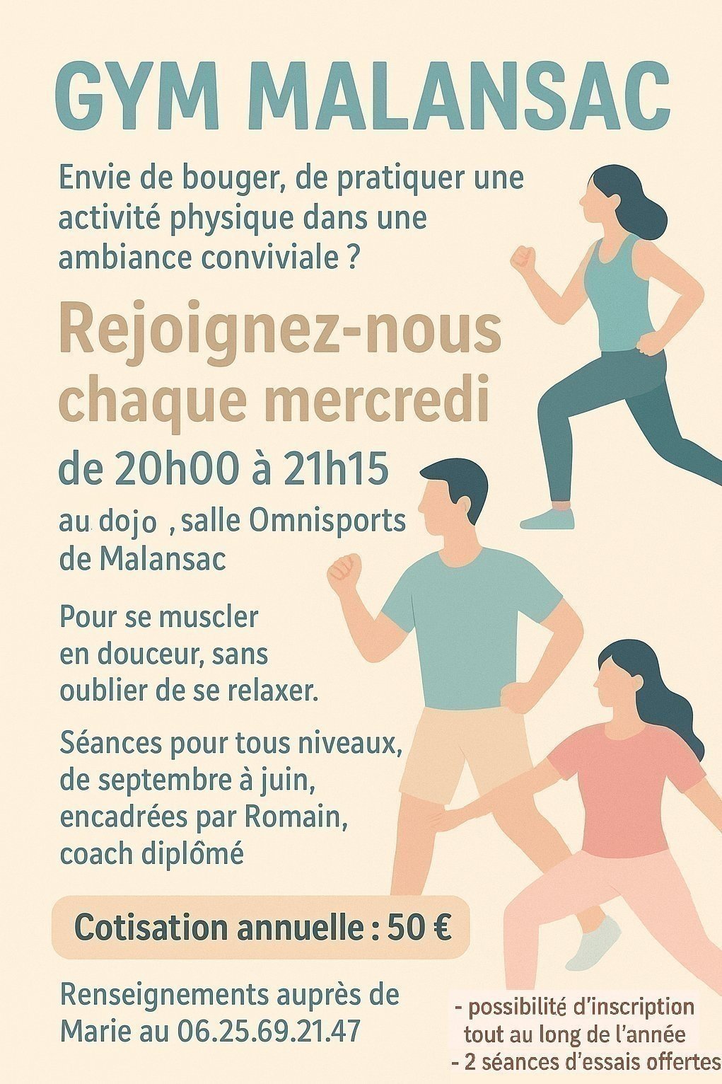 Possibilité de s'inscrire en cours d'année. Les deux premières séances sont offertes et sans engagement.