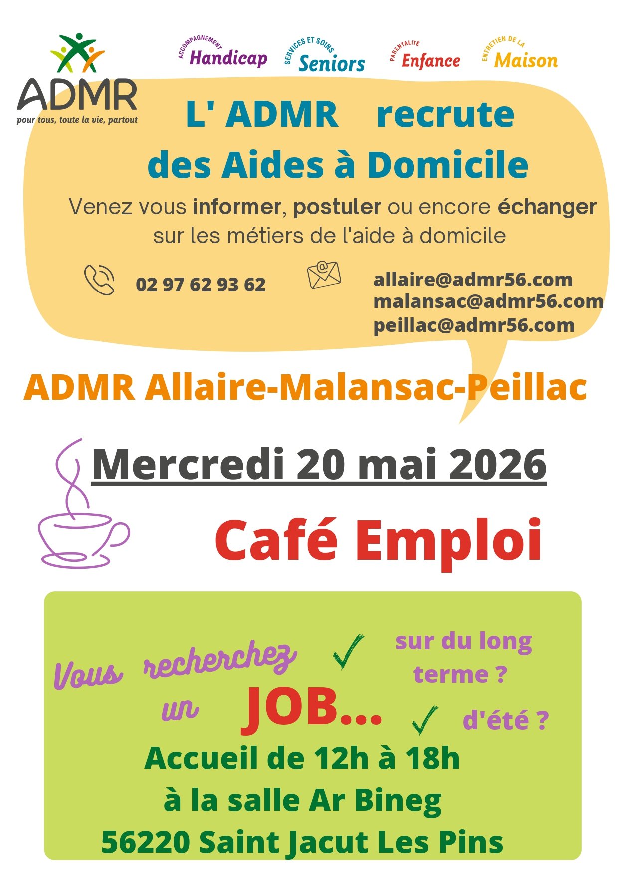 Dans le cadre de sa campagne de recrutement pour un job d'été ou un emploi sur du long terme, l'ADMR DES VALLÉES DE L'ARZ Allaire-Malansac-Peillac vous convie à un
