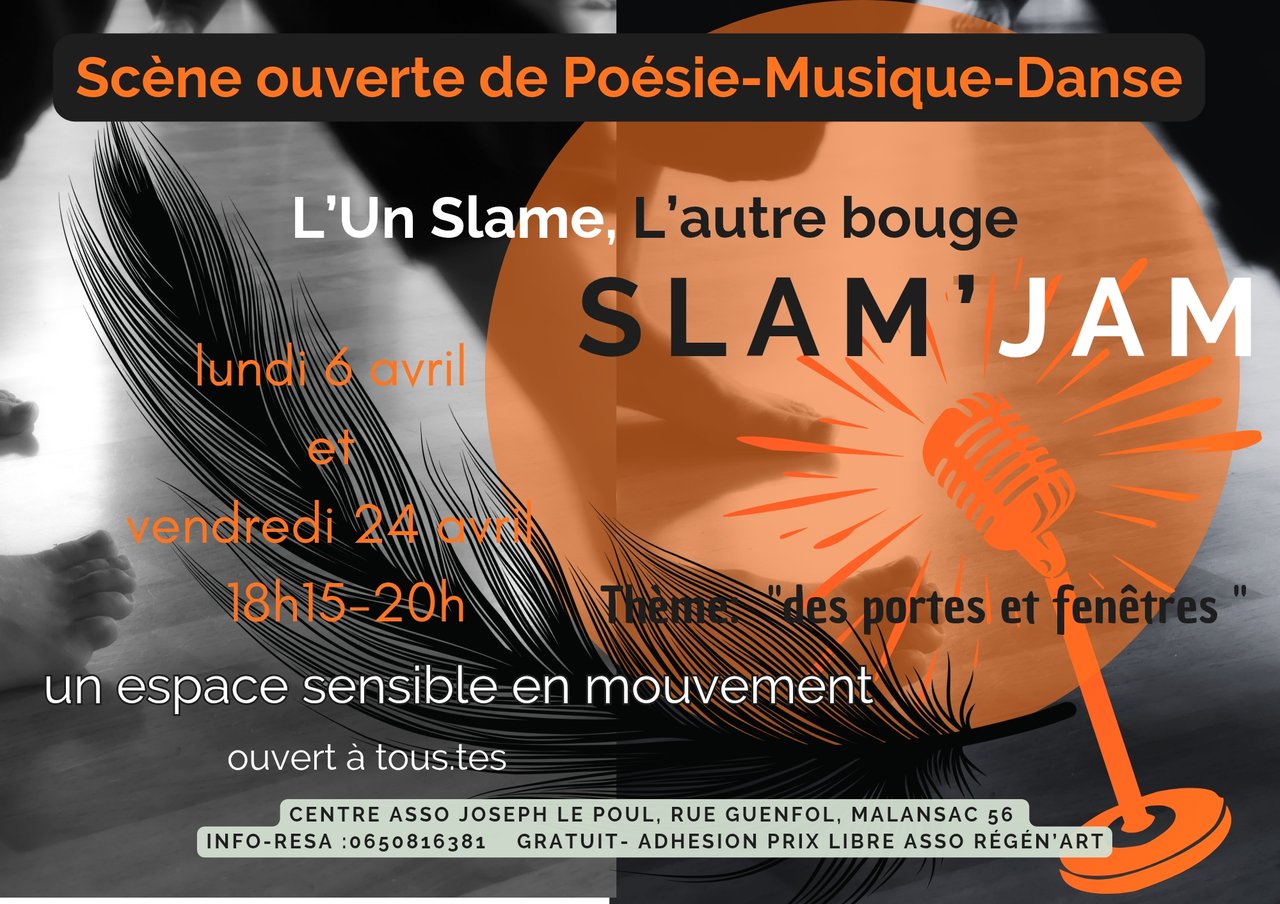 Un échauffement sera proposé en début de Slam’jam et l’événement sera ponctué de propositions rythmiques , lumineuses, attentionnelle , spatiales...pour faire vivre et explorer différemment textes, musique et mouvement