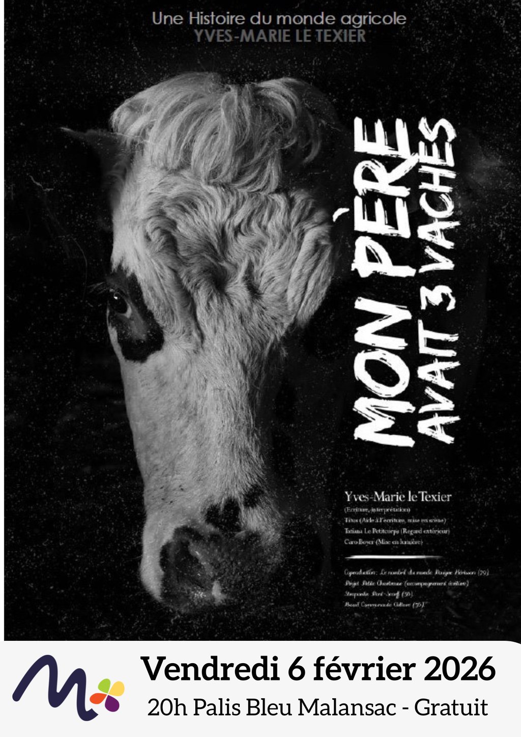 Le 6 février à 20h au Palis bleu (avec une buvette dès 19h), venez écouter Yves-Marie Texier (Cie Mouton Major) et plongez dans l’histoire du monde agricole.